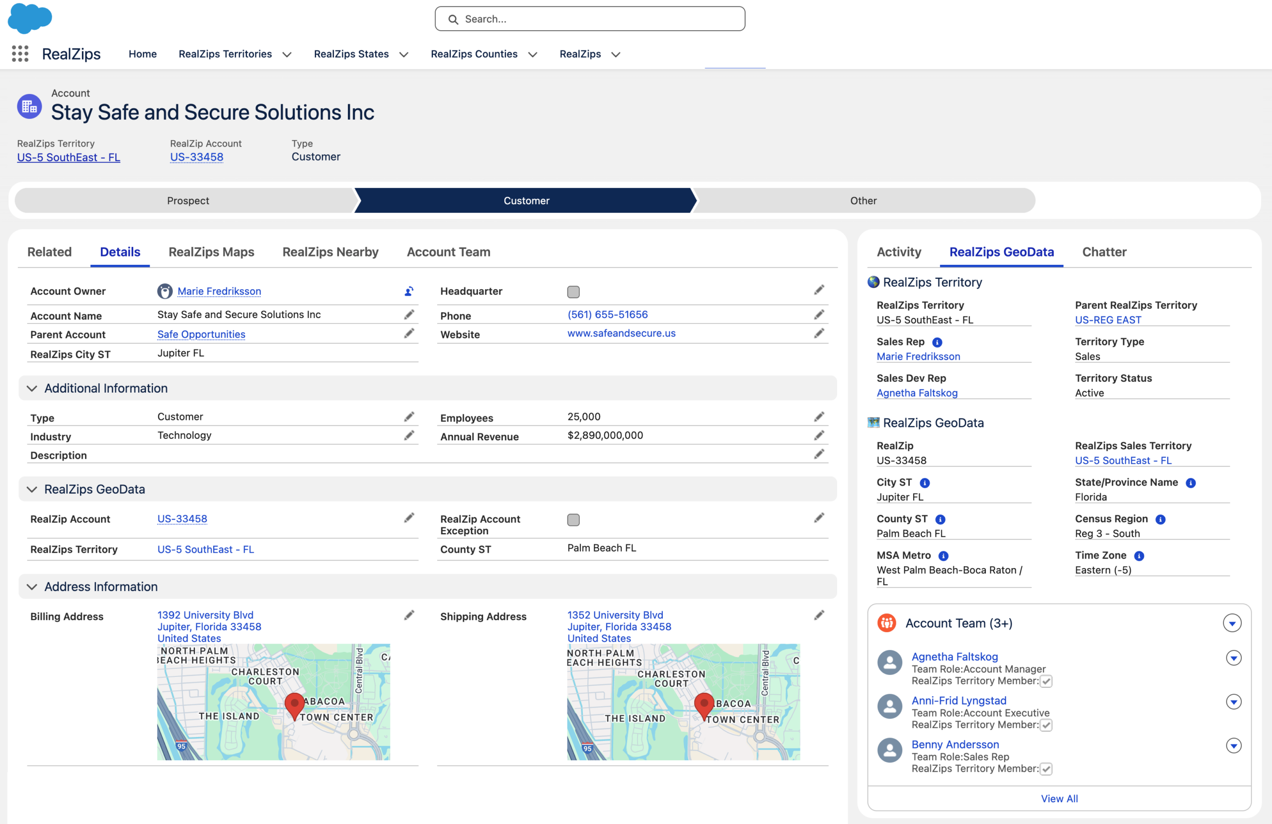 Solution: RealZips infuses each record with territorial context – automatically assigning regions, channel territories, sales territories, and specific owners or teams. By mapping every ZIP code to your custom territories and regions (which can overlap across multiple territories and channels), RealZips ensures that every lead, opportunity, and case in Salesforce includes the responsible party and the territory to which it belongs.